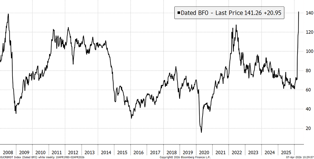 On the other hand, we see “Dated Brent” trading at all-time highs. This is a measure of the physical spot market rather than the financial futures market. That means it measures actual oil cargoes as opposed to cash-settled financial derivative transactions. Dated Brent is above the levels of the early war in Ukraine and the peak in 2008. There continues to be considerable stress in energy markets, which will not calm down until the Strait of Hormuz reopens.